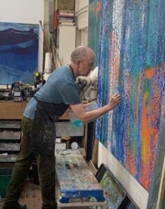 Richard is an abstract painter based in a light-filled studio in Sussex, an acorn’s throw from the Ashdown Forest. He paints using print-making tools, brushes and bespoke squeegees. He works to re-mould inner spaces, to invite attention to and engagement with surface and depth, with what is hidden and what is revealed.